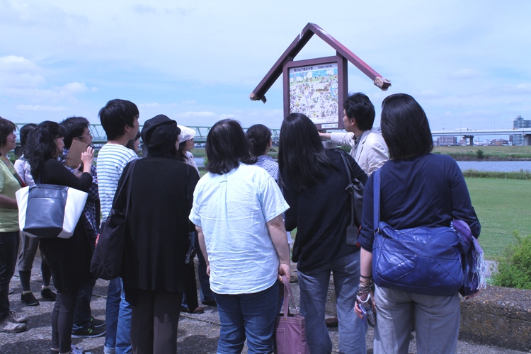 3回目の開催となります「大人の革工場見学」。今回から、下町歩きと革クラフト体験が加わり、革の歴史から、革んことをより深く知れる内容となりました。下町歩きでは、かつての革の町の様子や、荒川土手に上がり、荒川を眺めながら川を利用した木材輸送の様子、関東大震災のこ頃について知りました。